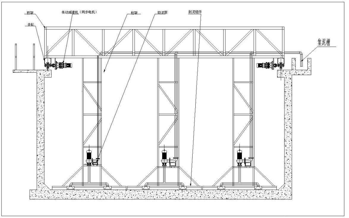 行車式吸泥機又稱橋式吸泥機,是給水工程中平流式沉淀池和污水處理工程中二次平流式沉淀池等專用排泥設備。該機可以克服活性污泥比重小含水率高二難以刮集的困難,目前我公司生產的桁架式吸泥機分為斜板(管)虹吸式吸泥機、不帶斜板(管)吸泥機和泵吸式吸泥機等三種。