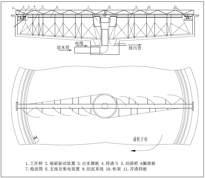 中心支座由固定支撐座、回轉軸承和橋架組成,可同時承受軸向力、徑向力和傾覆力矩。集電裝置采用滑環式集電裝置,由集電環和電刷架組成。浮渣刮板、浮渣耙板、浮渣漏斗組成排渣機構,能有效地清除水面浮渣。工作橋是連接中心支座和行走端梁的大型部件,其上有走道板和欄桿,鋼梁的下面連接刮泥結構、排渣機構等,在行走裝置的帶動下來完成刮泥、排渣工作。