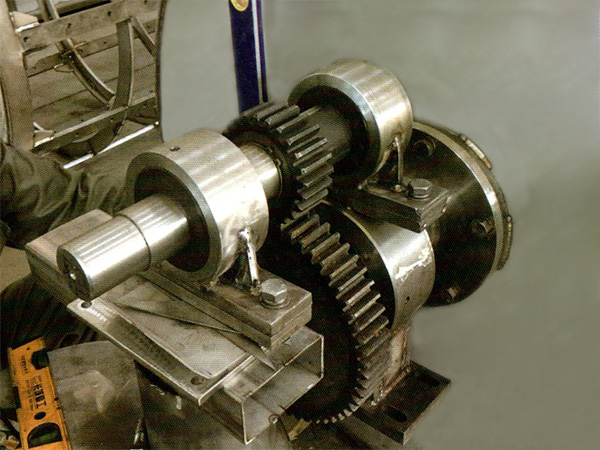 驅動系統由減速電機、傳動軸、中心軸承等組成。