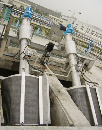 旋轉(zhuǎn)清污網(wǎng)筒在水中以35°傾角做每分鐘5~8r/min的圓周運(yùn)動(dòng),網(wǎng)筒的1/3浸沒在水中。污水及漂浮物從網(wǎng)筒下口進(jìn)入網(wǎng)筒內(nèi)部,漂浮物附著于網(wǎng)筒內(nèi)壁從水中帶出,當(dāng)網(wǎng)筒轉(zhuǎn)到高點(diǎn),雜質(zhì)由于重力作用掉入垃圾輸送系統(tǒng),經(jīng)輸送壓榨至出料口。被過濾的污水經(jīng)過網(wǎng)筒間隙流走。